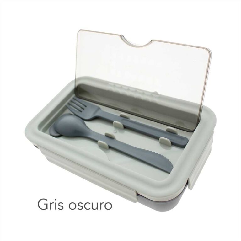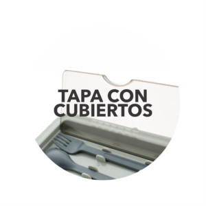 Tapa con cierre hermético. Incluye cuchara-cuchillo y tenedor.
