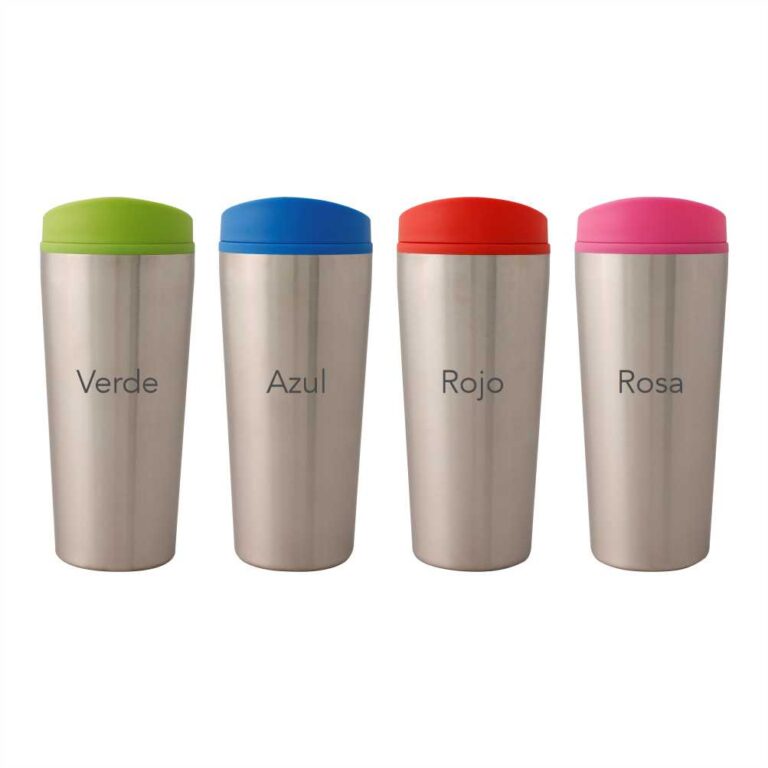 Doble pared. Acero inoxidable y plástico. Disponible en 4 distintos colores.